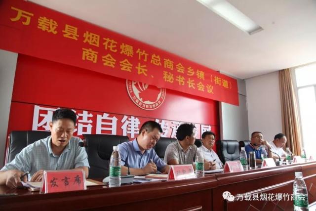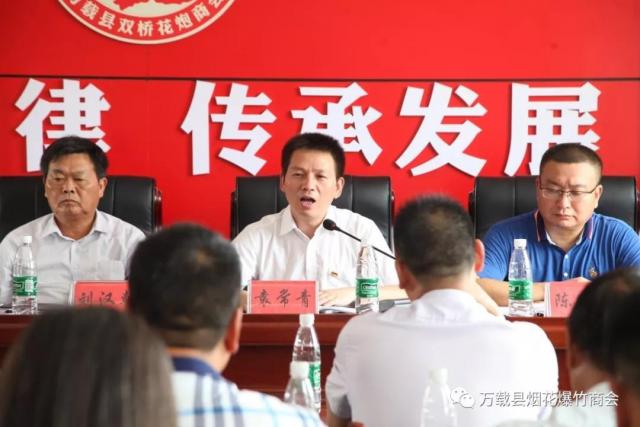 7月3日上午9:00,万载县烟花爆竹总商会乡镇(街道)商会会长、秘书长会议在双桥商会召开。副县长袁常青、县总商会总顾问刘汉朝、县花炮局局长刘小金、县安监局负责人陈宏伟、双桥镇镇长易永锋、县总商会会长刘包贵、县总商会秘书长王清平、县总商会常务副会长代表及各乡镇商会会长、秘书长参加此次会议。
