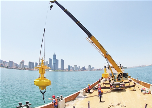 6月29日,工作人员将浮标式海洋环境在线监测系统投放在山东省烟台市芝罘湾海域。当日,首批4座浮标式海洋环境在线监测系统在山东省烟台市近海海域投放并投入使用。唐克 摄 (新华社发)